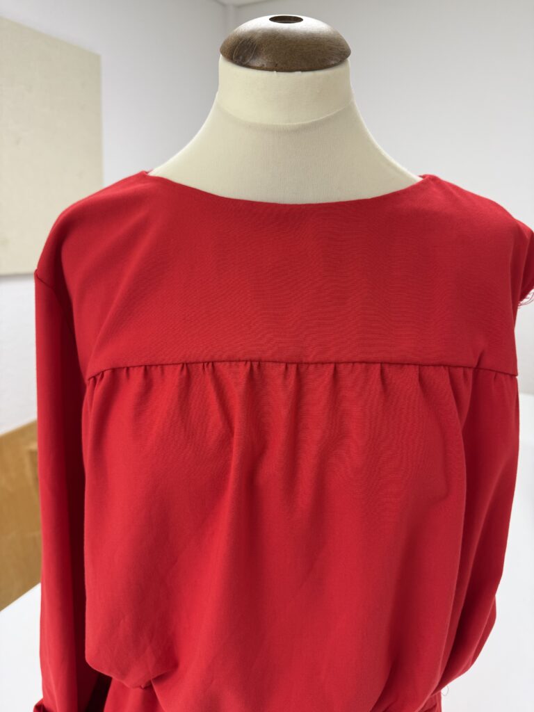 Bei den Fältchen unterhalb der Passe hatte ich aufgrund der Abbildung im Heft mehr Volumen erwartet. Es wird auf der ganzen Strecke eingekräuselt, was ich mithilfe von 2 Steppnähten umgesetzt habe. Ob das am Stoff liegt, dass die Kräuselung hier nicht so plastisch wirkt wie im Burdaheft? Hat jemand eine Idee dazu?