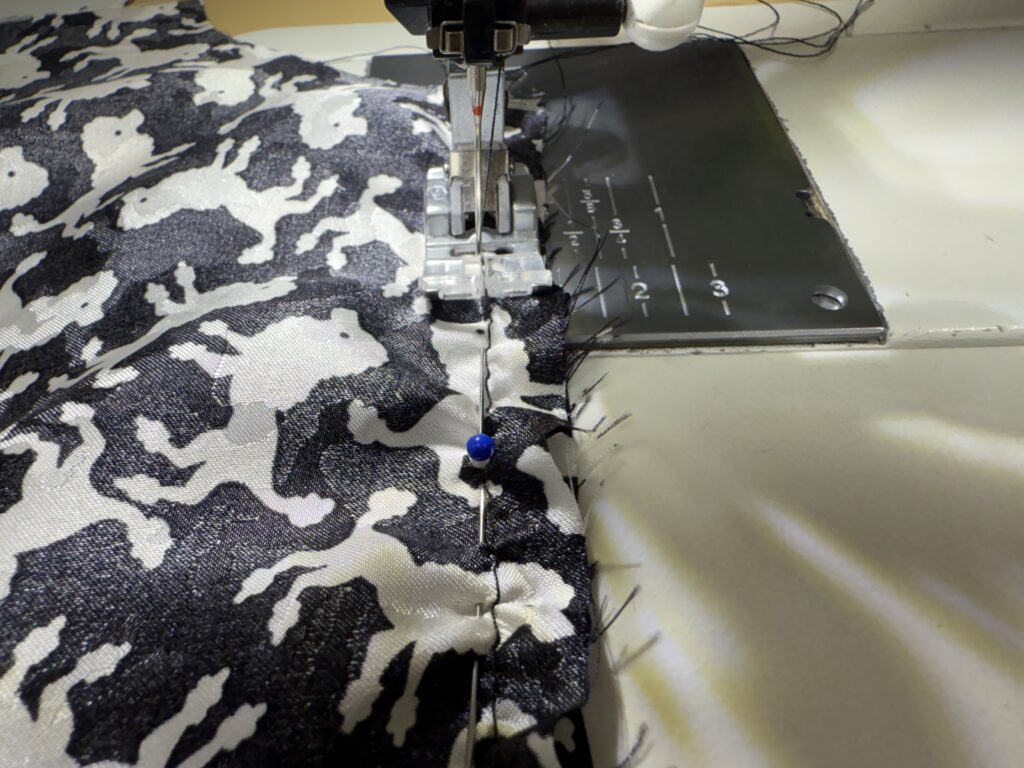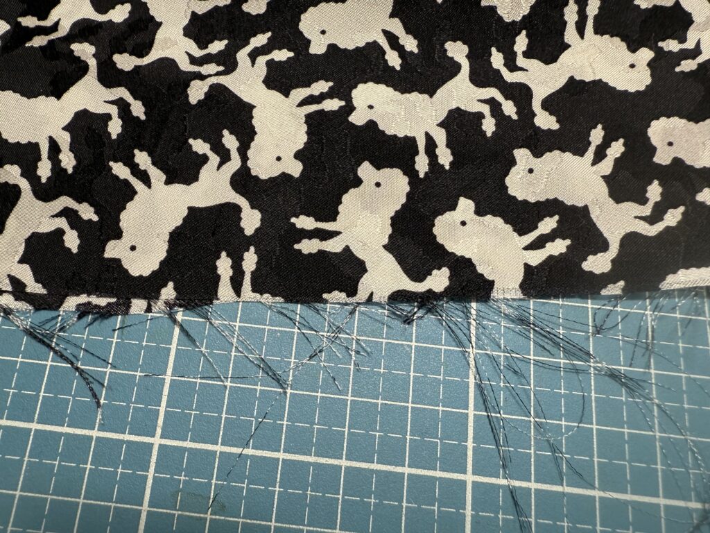 Unter der Nähmaschine liegt der Stoff nicht so flutschig wie befürchtet. Allerdings ist er stark fransend, wie auf dem Foto zu sehen.
