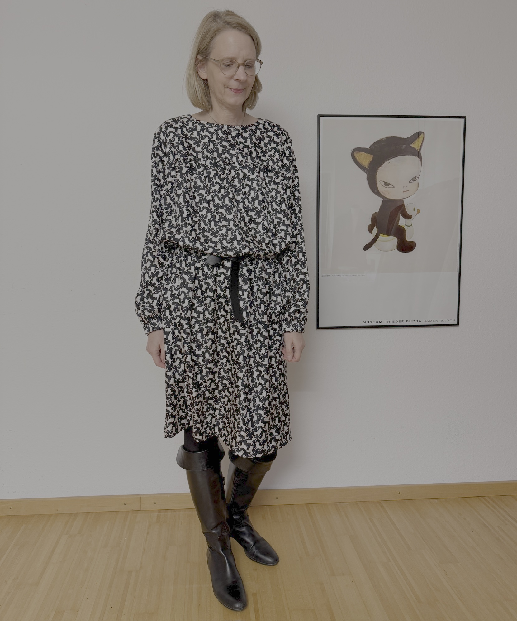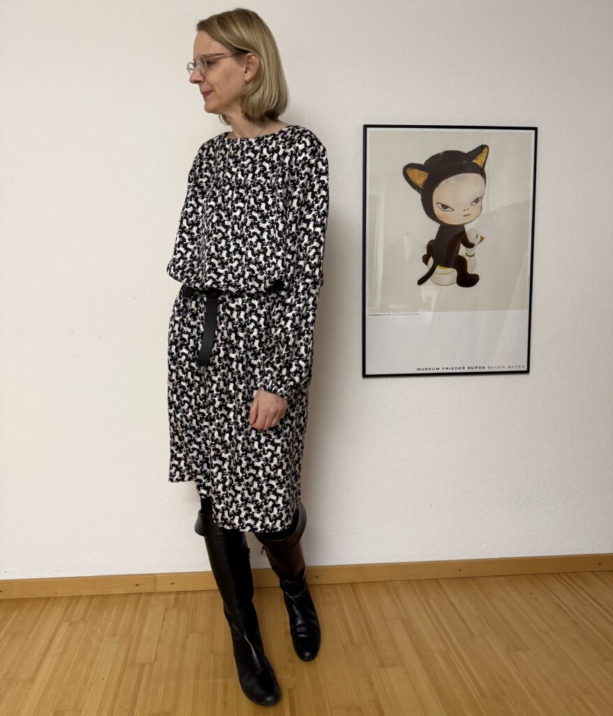 Das Schnittmuster habe ich aus dem Weihnachtsheft (Burdastyle 12/2025, Modell 104) rauskopiert. Ein eher sportliches Kleid mit U-Boot-Ausschnitt, der auf dem Foto im Heft komplett durch einen Schal verdeckt ist. Ich war mir nicht ganz sicher, ob der Ausschnitt gut sitzen wird.